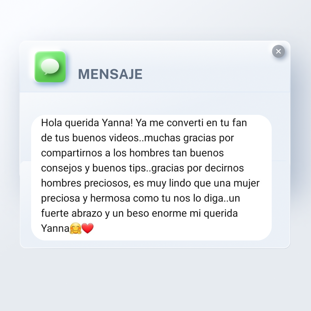 Hace un año pasé por una situación de rompimiento, y gracias a los consejos, libros y videos de Yanna, he logrado superarme y estar feliz nuevamente. Yanna, muchísimas gracias, muchos éxitos y te quiero mucho.